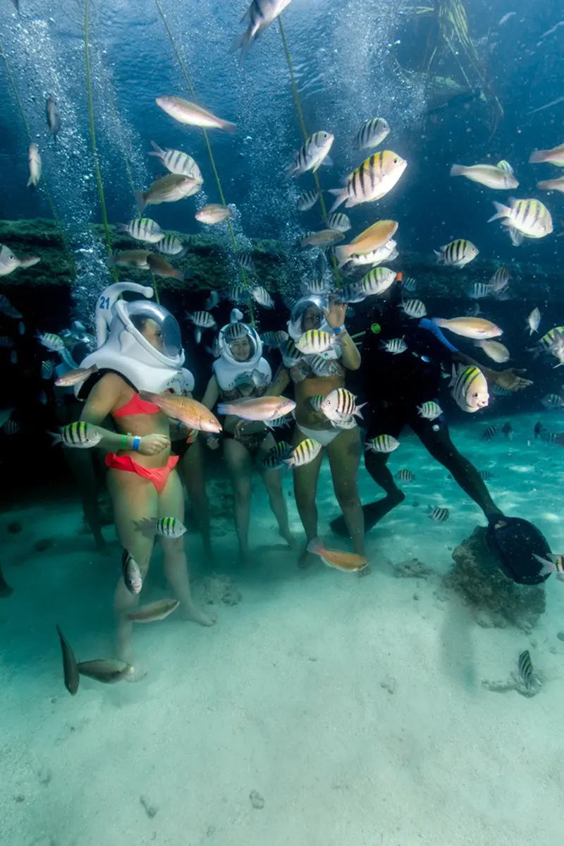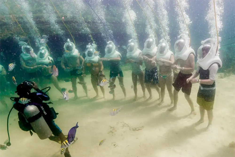 La caminata submarina es tan sencilla como caminar y respirar bajo el agua, gracias al casco conectado al suministro de aire. Además, siempre estarás acompañado por buzos profesionales, quienes garantizan tu seguridad durante toda la experiencia.